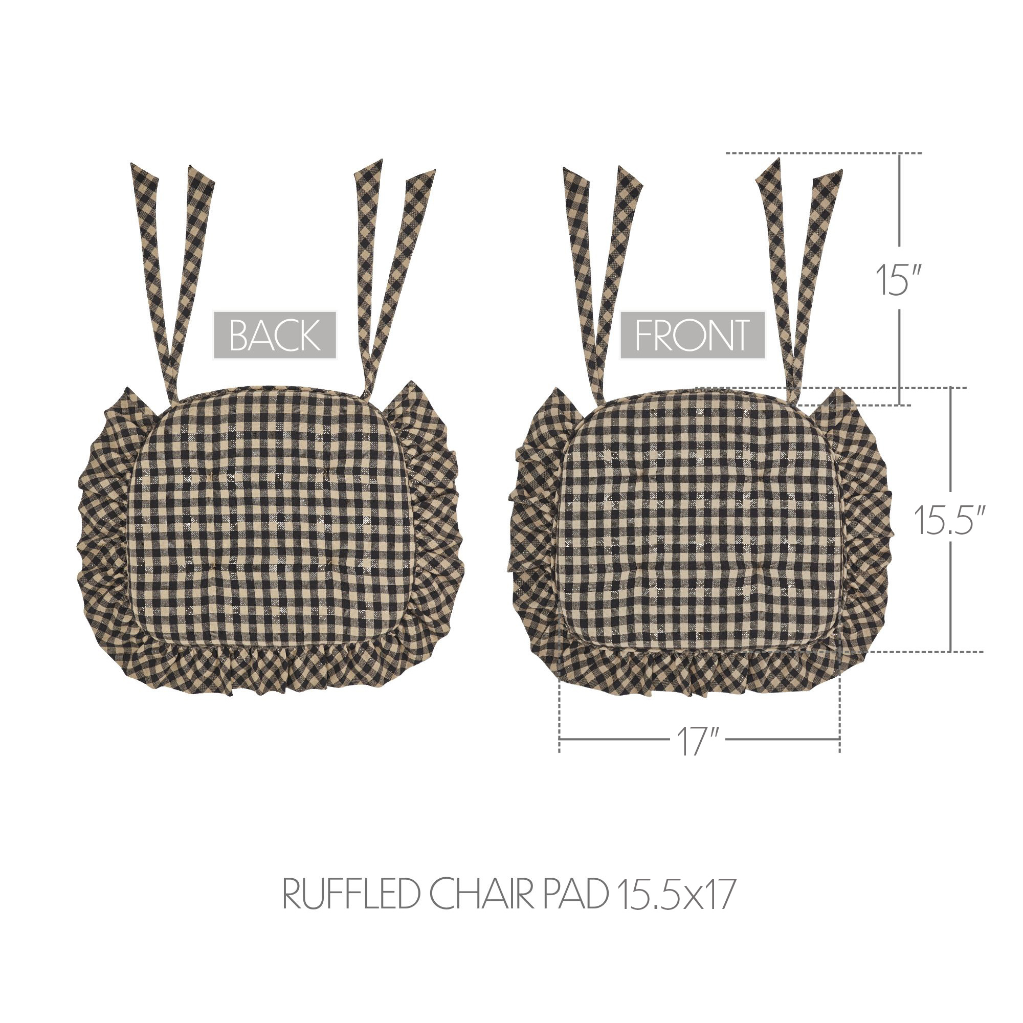 Black Tan Check Ruffled Farmhouse Country Chair Pad W Ties 15.5x17 - VHC Brands